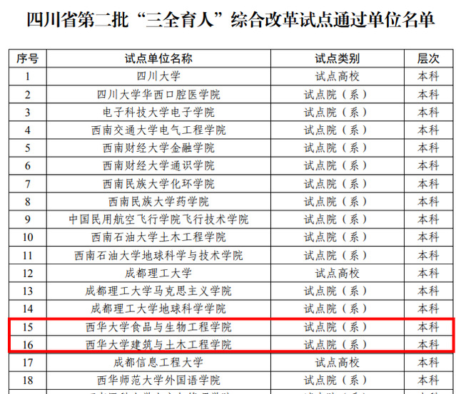近日,中共四川省委教育工委办公室发布《中共四川省委教育工委办公室关于公布第二批、第三批“三全育人”综合改革试点总结评审结果的通知》(川教工委办函〔2025〕7号),我校食品与生物工程学院、建筑与土木工程学院、马克思主义学院顺利通过评审。其中,食品与生物工程学院提交的案例《强化班导师育人机制,释放综合改革新效能》获评“综合改革试点优秀典型案例”。