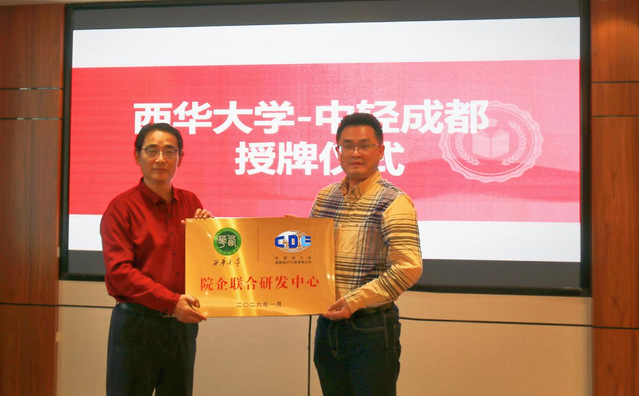 座谈会上,中轻成都各事业部介绍各自业务领域及人才需求情况,双方重点围绕人才招聘、科研合作、实习就业等展开深入交流,共同举行“西华大学-中国轻工业成都设计工程有限公司校企联合研发中心”和“西华大学实习就业基地”授牌仪式。