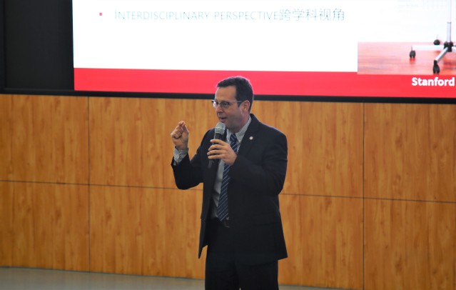 揭牌仪式结束后,斯坦福大学副教务长Paul Marca为大家带来了题为“斯坦福大学的创新与创业”的主题讲座。Paul Marca从斯坦福大学的创新创业工作思路、创新创业成果转换、创新创业教育理念等方面详细介绍了斯坦福大学的创新与创业。他由斯坦福夫妇的故事引入,介绍了斯坦福大学的历史并列举了其创新创业方面取得的成果。他还向大家展示了斯坦福大学设计思维过程的五个步骤,说明了斯坦福设计创新模型的构成。Paul Marca分享了许多创新创业教育理念,提出了注重组建团队、共同承担风险、尽早失败多次失败、同理心文化、原型设计文化、走向全球、点子文化等观点。最后,Paul Marca引用知名运动品牌NIKE创始人的座右铭“Just Do It”和孔子的名句“人无远虑,必有近忧”,鼓励大家放手去做,用实际行动把理想变为现实的期望。