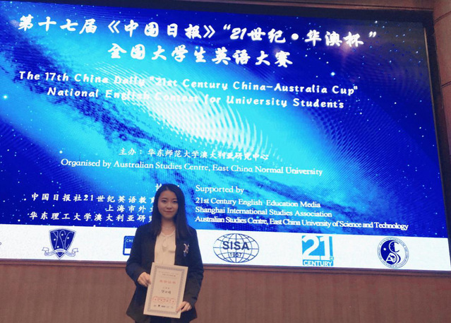 12月7日,第十七届《中国日报》“21世纪·华澳杯”全国大学生英语大赛在华东师范大学举行。我校外国语学院2018级翻译专业学生樊秋婧参加比赛并荣获三等奖,指导教师陈达教授被评为“优秀指导教师”。