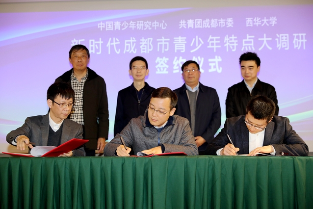 随后,三方举行了新时代成都市青少年特点大调研签约仪式。中国青少年研究中心、西华大学、共青团成都市委有关负责同志代表各单位签署三方合作协议,三方领导上台共同见证签约,标志着新时代成都市青少年特点大调研工作正式启动。