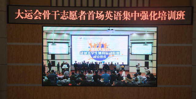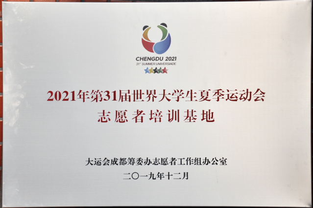 为落实成都市市委、市政府对2021年成都大运会志愿者服务工作的要求,12月19日晚,大运会成都筹委办志愿者工作组在成都理工大学举办志愿者培训基地授牌仪式暨骨干志愿者英语集中强化培训开班仪式。我校作为10个2021年大运会志愿者培训基地之一,参加了志愿者培训基地授牌仪式,标志着我校的大运会骨干志愿者培训工作拉开帷幕。同时,我校作为集中强化培训郫都区分会场,在四教报告厅组织志愿者观看了直播,来自西华大学、西南交通大学、成都信息工程大学银杏酒店管理学院等五个高校的志愿者参加了活动。
