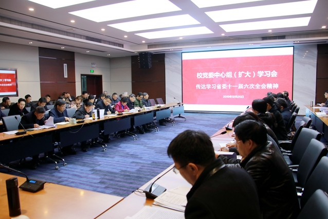 12月25日,校党委中心组扩大学习会在办公楼101会议室举行,专题传达学习省委十一届六次全会精神,研究学校贯彻落实意见。全体校领导、机关及业务部门主要负责人,各学院党委(党总支)书记、院长参加会议。会议由校党委书记边慧敏主持。