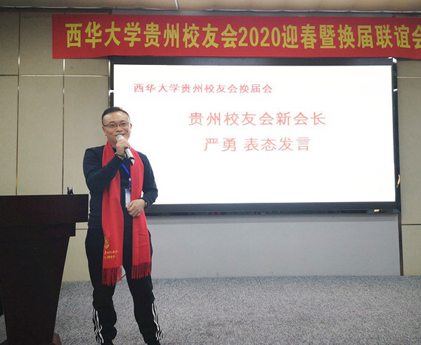 接着,新一届贵州校友会会长严勇发言。他代表贵州校友会对母校一行的到来表示热烈欢迎,对上一届理事会成员对贵州校友会做出的奉献表示感谢。他说到,校友会是校友与母校之间互相联系的重要纽带和桥梁,也是校友间交流信息、联络感情、资源共享的重要平台,希望能有更多的校友为贵州校友会添砖加瓦。他表示,新一届理事会将全力履行好职责,继续发扬母校“求是、明德、卓越”的校训,积极联络校友、凝结力量,把贵州校友会建设成为校友之家、校友和母校互通的桥梁,扎实做好服务校友工作,充分发挥校友会对母校的推动作用,为母校的建设和发展做出贵州校友们的贡献。