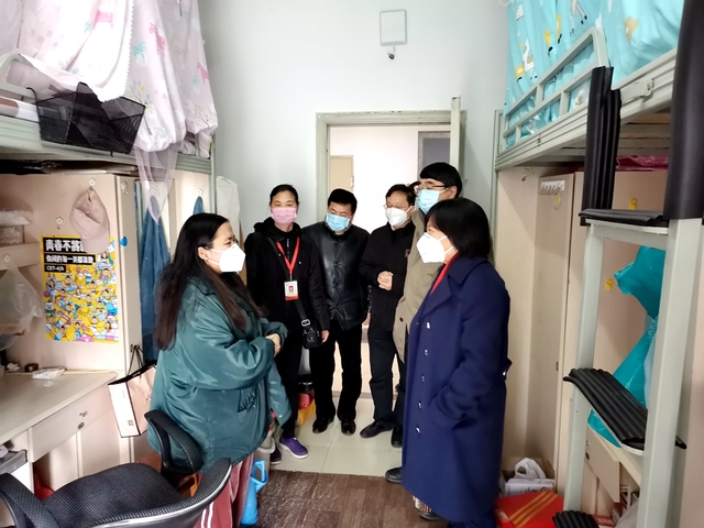 会议结束后,边慧敏书记带队来到一食堂、校医院、德馨苑、西大门等地,看望慰问坚守岗位的干部职工和留校学生,检查指导疫情防控工作。校领导现场查看了校园出入管理、校门体温检测、食堂食品卫生安全管理、校医院防疫工作物资储备、卫生防疫等工作开展情况,强调要全面加强疫情防控工作,确保师生平安。
