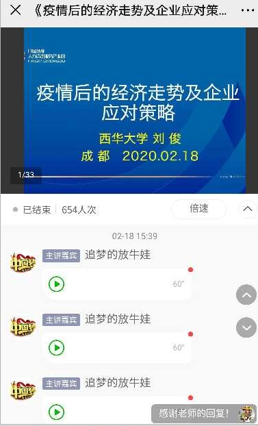 成都市人大代表、九三学社西华大学委员会副主委、我校经济学院副教授刘俊受中国成都人力资源产业园的邀请,近日通过在线网络平台为产业园100多个企业开设公益网络课程讲座《疫情后的经济形势及企业的应对策略》,600多位网友参加了该网络课程。刘俊还积极和受疫情影响严重的企业进行互动沟通,帮助企业就复工相关问题出谋划策。