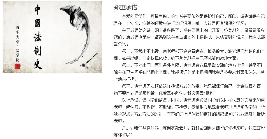 如果没有发生疫情,我这学期其实也是准备在我的《中国法制史》课上尝试全面的线上线下混合式教学的,上学期已经提交了申请,并进行了一些设计。寒假里,疫情的迅速蔓延一度让我感到无措,因为很多事情变得不确定,直到收到学校的通知:按计划开学,全面开展线上教学。一方面是因为本有准备,另一方面是因为终于有一件确定的可以如期进行的事,我带着期待多于紧张的心情开启了我的线上教学之旅。