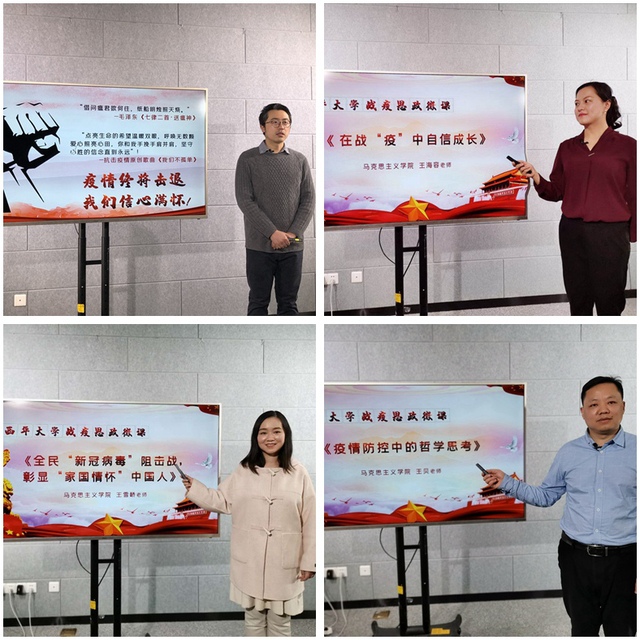 学院充分发挥思想政治理论课主渠道作用,将全国人民齐心协力抗击疫情的重大举措、感人事迹、生动故事与思想政治理论课理论教学紧密结合,组建教师团队,发挥专业特长和学科优势,以“勇担使命,在战疫中铸魂育人”为主题,集中打造抗疫主题思政微课。张明辉老师主讲《战疫情:中华民族精神熠熠“升”辉》,王雪峤老师主讲《全民“新冠病毒”阻击战,彰显“家国情怀”中国人》,王海容老师主讲《在战“疫”中自信和成长》,王贝老师主讲《疫情防控中的哲学思考》。微课深入阐释了抗击疫情中升华的中华民族精神、植根于中华民族内核的“家国情怀”,阐释了疫情防控中体现出马克思主义哲学思维和中国特色社会主义制度优势。