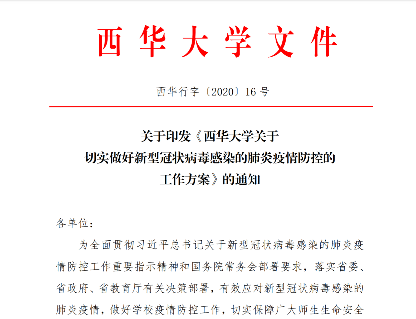 学校启动西华大学公共卫生类突发事件应急预案,完善应急处置机制;印发《西华大学关于切实做好新型冠状病毒感染的肺炎疫情防控的工作方案》《西华大学关于进一步做好疫情防控有关事项的通知》等,系统指导学校各单位责任意识“强”起来,防控举措“实”起来,后勤保障“暖”起来。