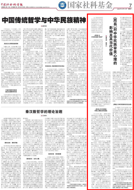 4月14日,《中国社会科学报》第7版“国家社科基金专刊”第195期刊载了我校潘殊闲教授、成都信息工程大学戴丽红教授的文章“《周易》对中华民族审美心理的影响及其当代价值”。潘殊闲教授系国家社科基金重点项目“《周易》与中华民族审美心理特色及其当代价值研究”负责人,全文如下: