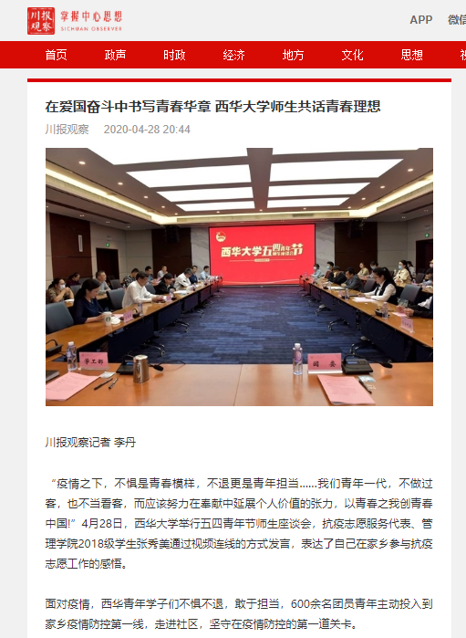 4月28日下午,西华大学五四青年节师生座谈会在办公楼101会议室举行。校党委书记边慧敏、校长刘树根、校党委副书记王小林与13名青年学生代表采用线上线下相结合的方式共庆佳节,表彰2019-2020学年五四青年节先进集体和个人,集体学习“3.15”习近平总书记给北京大学援鄂医疗队全体“90后”党员回信,畅谈学习感悟,共话青春理想。这场特别的五四青年节师生座谈会受到了主流媒体的关注,中国青年网、新华网、中国社会科学网、川报观察、四川在线、四川之声、封面新闻等媒体对此进行了报道。