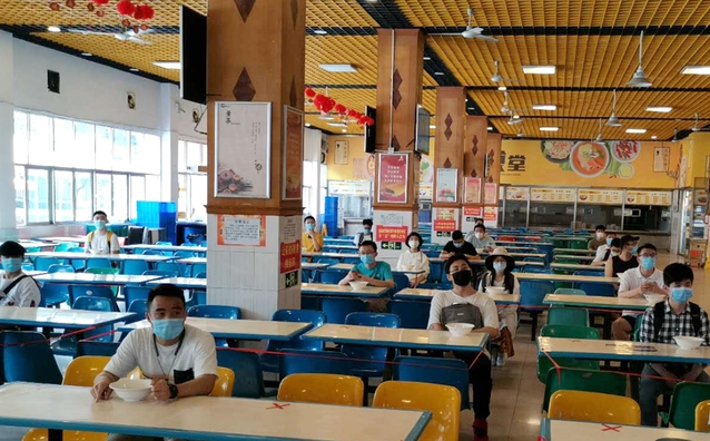 学生错峰就餐演练在一食堂举行。用餐前,同学们自觉在食堂外洗手池按“七步洗手法”清洁双手并保持安全距离。在餐厅门口,同学们听从现场工作人员指示,保持安全距离排队通过测温区。同时,学校要求在售卖窗口排队选餐时需保持1米间距。在食堂就餐的同学取餐后,选择在未贴封条的座位入座就餐。同学们用餐完毕有序离开后,工作人员立即对餐桌进行清洁和消毒。