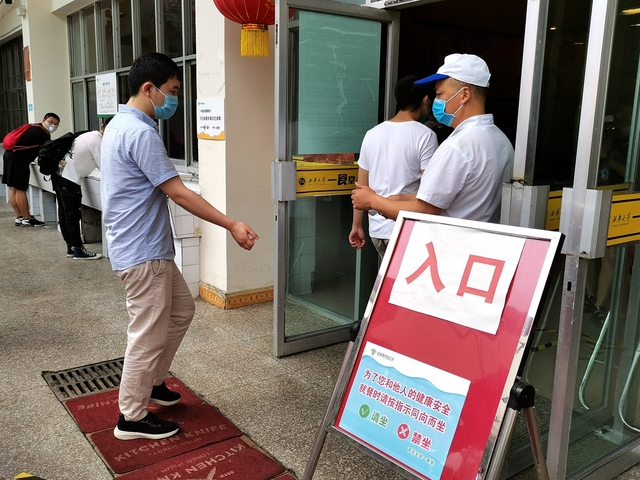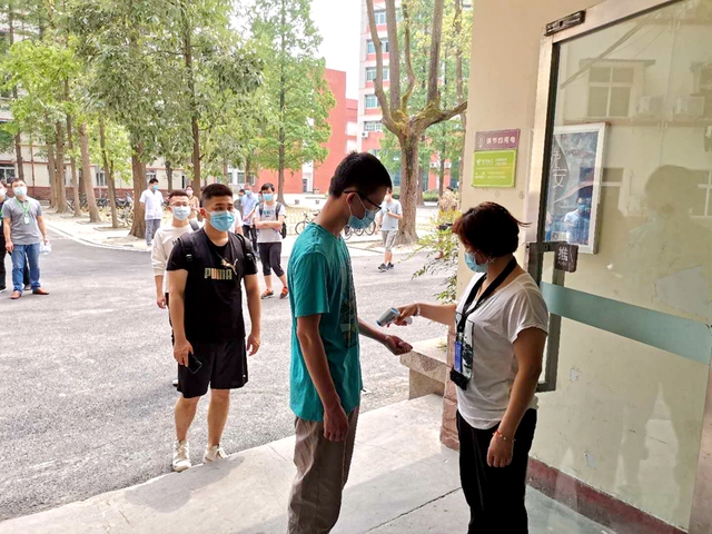 在学生二宿舍,学校举行了返校学生入住公寓安全流程演练。同学们按地面标识,保持1米距离自觉排队。演练中,出现有“体温异常”的(高于37.3度)学生,工作人员立即报告,学生进入临时观察区,校医务人员迅速到位,对发热学生再次测试体温并进行询问,休息片刻后,该同学体温显示正常,顺利入住公寓。