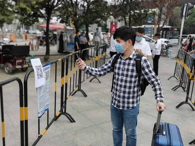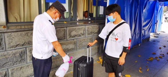 首先进行学生返校报到安全演练。按照学校相关管理规定,学生入校期间,校外车辆人员禁止进入校园。返校报到学生按地面标志,前后间隔1米距离排队,扫码验证后,方可到达测温区。体温测试合格后,进入行李消毒区,消毒人员对学生行李进行全面消杀。