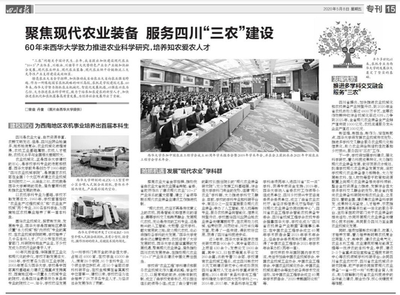 5月8日,《四川日报》以“聚焦现代农业装备 服务四川‘三农’建设”为题,从“建校初心 为西南地区农机事业培养出首届本科生”“抢抓机遇 发展‘现代农业’学科群”和“发挥优势 推进多学科交叉融合服务‘三农’”三个部分,深入报道了我校60年来抢抓农业机械化、智能化发展机遇,以强农兴农为己任,大力推进农业科学研究,致力于培养知农爱农的新型人才,加快推进农机化和农机装备高质量发展所取得的成绩。