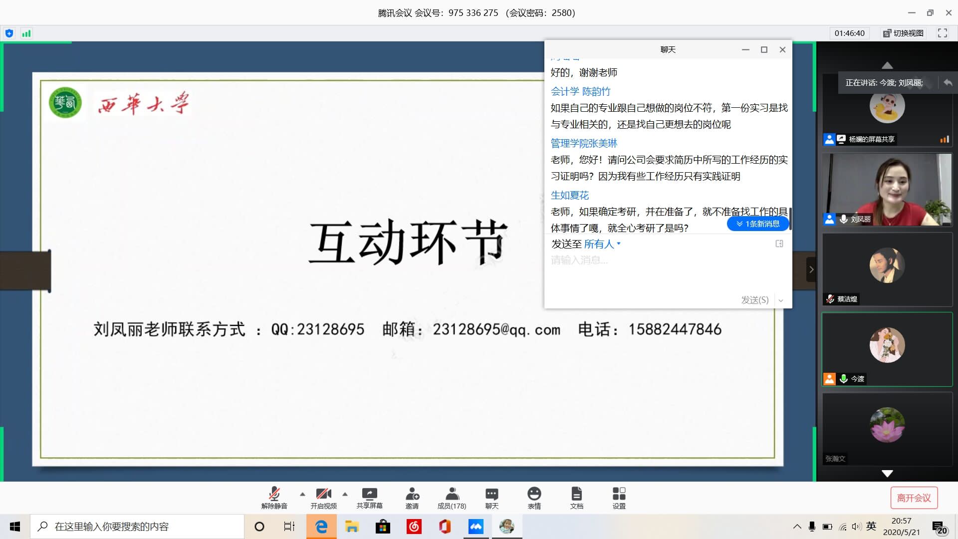 大赛期间,为帮助同学们更好地了解就业、了解简历、了解面试,我校于5月21日晚19:30,举办《一“简”倾心,面“面”俱到——浅谈疫情影响下如何提升就业能力》公开课。本次课程由杨舒婷老师主持,全国就业指导分析师刘凤丽老师主讲。刘老师首先对参赛作品进行细致点评,而后围绕疫情下的就业形势、就业政策、如何制作吸睛简历、如何在面试中途脱颖而出等问题进行讲解,最后在互动提问中对同学们的众多问题一一进行解答,同学们纷纷表示受益匪浅。