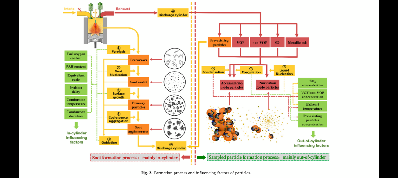 从颗粒形成的过程出发,探究了不同因素对颗粒排放的影响,提出了一种RCCI发动机尾气中颗粒排放的影响机理。柴油机颗粒的形成应分为缸内和缸外两个过程。缸内颗粒的六个形成过程主要受到燃料-空气混合特性,包括燃料氧含量、PAH含量和当量比,以及燃烧特性,包括滞燃期、缸内温度峰值和燃烧持续期等因素的影响;而缸外颗粒的形成主要受到包括硫酸及硫酸盐浓度、挥发性和非挥发性有机物浓度、排气温度和预存颗粒浓度等因素的影响。研究中还发现了滞燃期对RCCI发动机中的颗粒排放没有决定性的影响,同时还发现缸内过程的缸内温度峰值,缸外过程的排气温度和有机物浓度对颗粒具有强烈的影响作用。