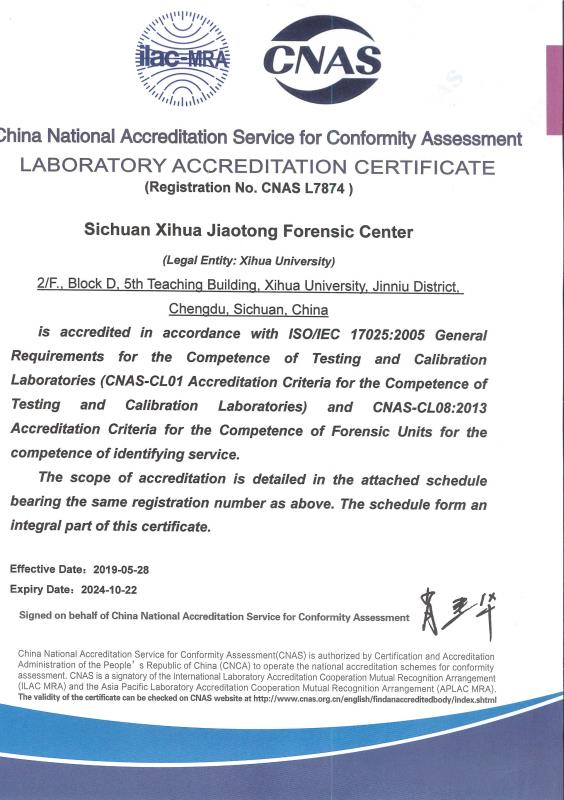 CNAS是国际实验室认可合作组织(ILAC) 和亚太实验室认可合作组织(APLAC)的互认协议成员。目前鉴定中心是学校唯一获得国家CNAS实验室认可证书的机构。