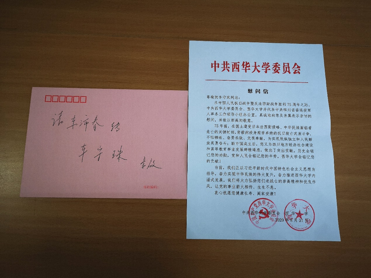 在纪念中国人民抗日战争暨世界反法西斯战争胜利75周年之际,按照四川省教育厅的统一部署,校党政办公室、离退休工作处、人事处三部门在9月3日前对参加过抗日战争的老战士老同志开展了慰问活动,代表学校送去慰问信和慰问金。