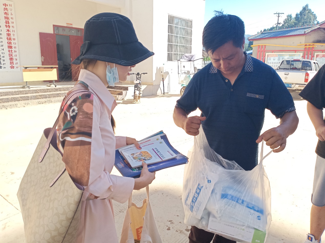 布拖县地处凉山州高寒山区,交通不便、卫生条件差,是全国还未脱贫摘帽的52个贫困县中的“硬骨头”,是国家在布托长期施行的“四治”方针。8月26至27日,在布拖县得机村文书罗晓斌的引导下,志愿队对得机村民进行了走访调研,调查当地16-45岁贫困青壮年劳动力普通话的使用情况以及使用过程中的困难,了解到得机村共有281户居民,90%的村民都是彝族,但是80%的青壮年村民都不会说普通话。志愿队向得机村村民宣讲了学习普通话的重要性,普及了常态化防疫的知识,带队老师彭陈丽代表学校向得机村捐赠了一批防疫物资和推普读物。