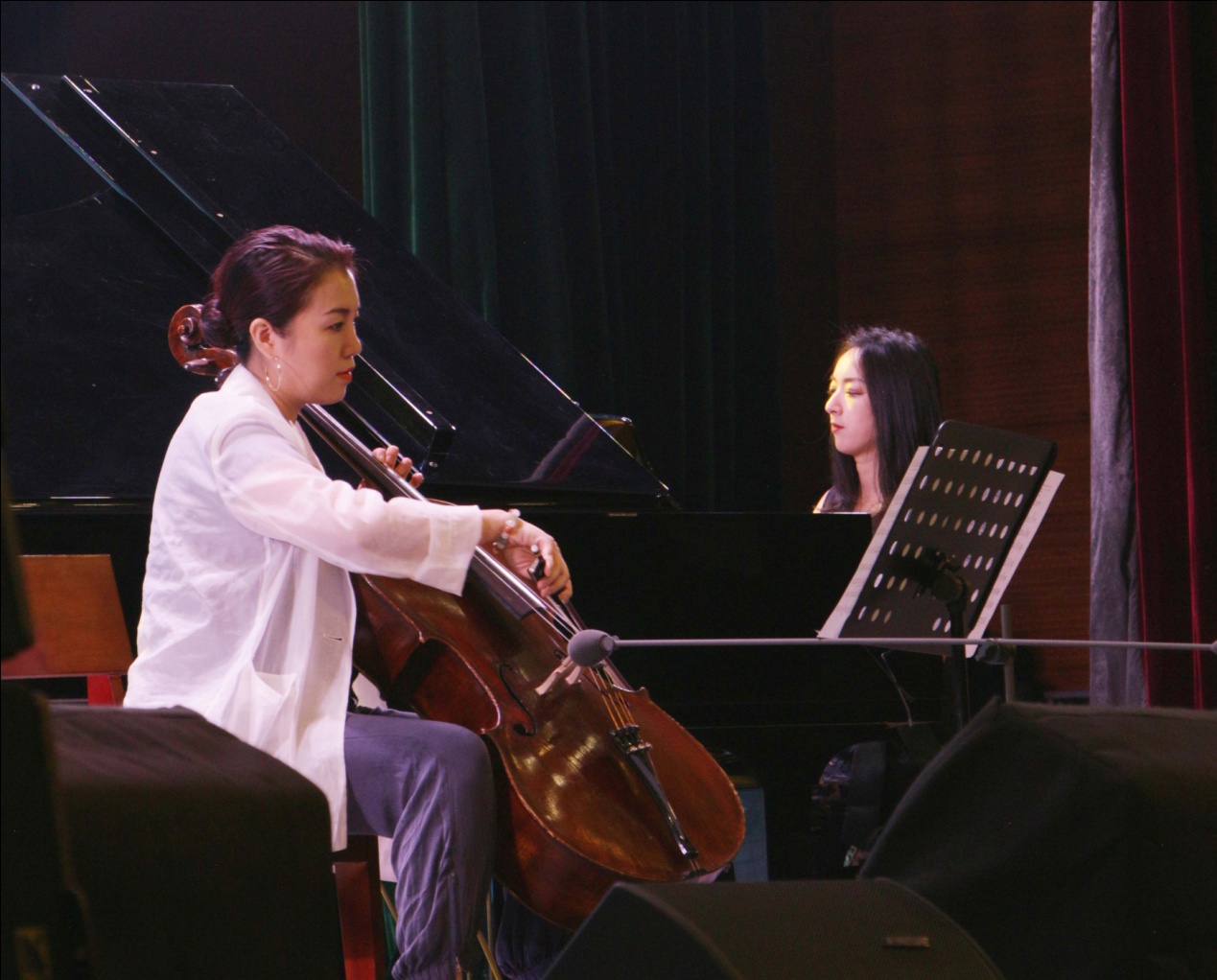 演出开始,叶小文和纪玉珏合奏了一首浪漫优雅,富于幻想色彩的《肖邦第二谐谑曲》,而后,气氛在舒展辽阔,富有浓郁草原气息的《牧歌》中迭起。从容、温暖的《当我遇见你》如森林中淙淙流淌的山泉小溪,散发着甜蜜、浪漫的情调,而后抒情转为叙事,感人的旋律深情款款地释放最温柔的情愫。接着,一首由杨娣与纪玉珏合作的即兴曲将现场气氛变得热烈起来。随后,叶小文、纪玉珏和杨娣三人合奏的《悲歌》悲怆却又慷慨激昂,《维瓦尔第g小调双大提琴协奏曲》将雄浑、高尚和奋进的激情蕴含在理性的严谨中,双大提琴的乐声迸发出生生不息的激情。最后,音乐演出在《向往》悠扬婉转的曲调中走向尾声,师生们意犹未尽,现场掌声经久不息。