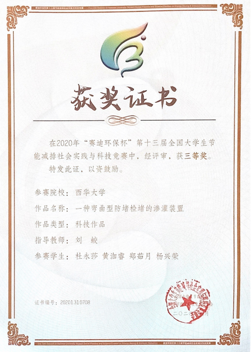 我校参赛作品首先历经校赛选拔脱颖而出,然后代表西华大学参加国赛。此获奖项目解决了渗灌管道孔容易堵塞的问题,解决了人员在管理、检查以及维修水管时遇到的难题,解决了修建设施投资高、成本高的问题。该项目在自身的设计上投入巧思,使用灵活,做到不同的流量设置标准适用于不同的土壤环境与农作物种类,同时,将检测渗灌孔堵塞的方式由测水流速、水压改变为测蓄水区蓄满的时间长短,更加直观地判断堵塞的具体情况。整体装置安全可靠,均采用物理原理进行防堵塞和检测堵塞工作,对实际应用提供很大帮助。