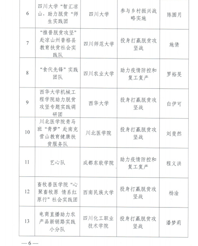今年全校共有186支暑期社会实践调研团队、1346名学子投身火热的社会实践中,积极开展助力打赢脱贫攻坚战、助力疫情防控和全面复工复产、经济社会民生观察等实践活动。学校创新实践形式,探索采取“云直播”“云帮扶”“云访谈”“云支教”等学生喜爱的方式,打破时间与空间的限制,确保实践活动不掉线,保障师生生命安全和身体健康。加强实践指导,组织召开校院两级培训会,邀请专家开展主题讲座,聘任思政课教师、辅导员、学工干部、共青团干部担任指导教师,提升实践质量。明确实践要求,引导学生在社会实践中形成可视化成果,设立“优秀调研报告奖”“优秀学术论文奖”“优秀工作案例奖”“优秀文艺作品奖”“优秀新闻宣传奖”等五类专项奖励,激励学生产出优秀社会实践成果,全校共形成学术论文和调研报告110余篇,助销帮扶案例20余个,支教活动60余次,创作文艺作品100余件,评定表彰41个优秀项目,深化社会实践育人实效。加强活动宣传,组织学生参加“我的返家乡实践故事征集”“2020年暑期返家乡社会实践优秀调研报告征集”“镜头中的三下乡”等系列活动,人民网、中国青年网、四川省人民政府官网、四川日报、川报观察、四川新闻网、四川教育网等媒体对活动关注报道。扩大活动影响,选树先进典型,组织云端分享会,宣传活动中的感人事迹、优秀案例、经验心得,扩大社会实践教育成果,营造良好的社会实践氛围。加强工作统筹,将社会实践纳入劳动教育学时认定,强化暑期“三下乡”社会实践与“挑战杯”大学生课外科技作品备赛联动,择优遴选优秀社会实践调研报告,为备赛“挑战杯”储备优质项目。