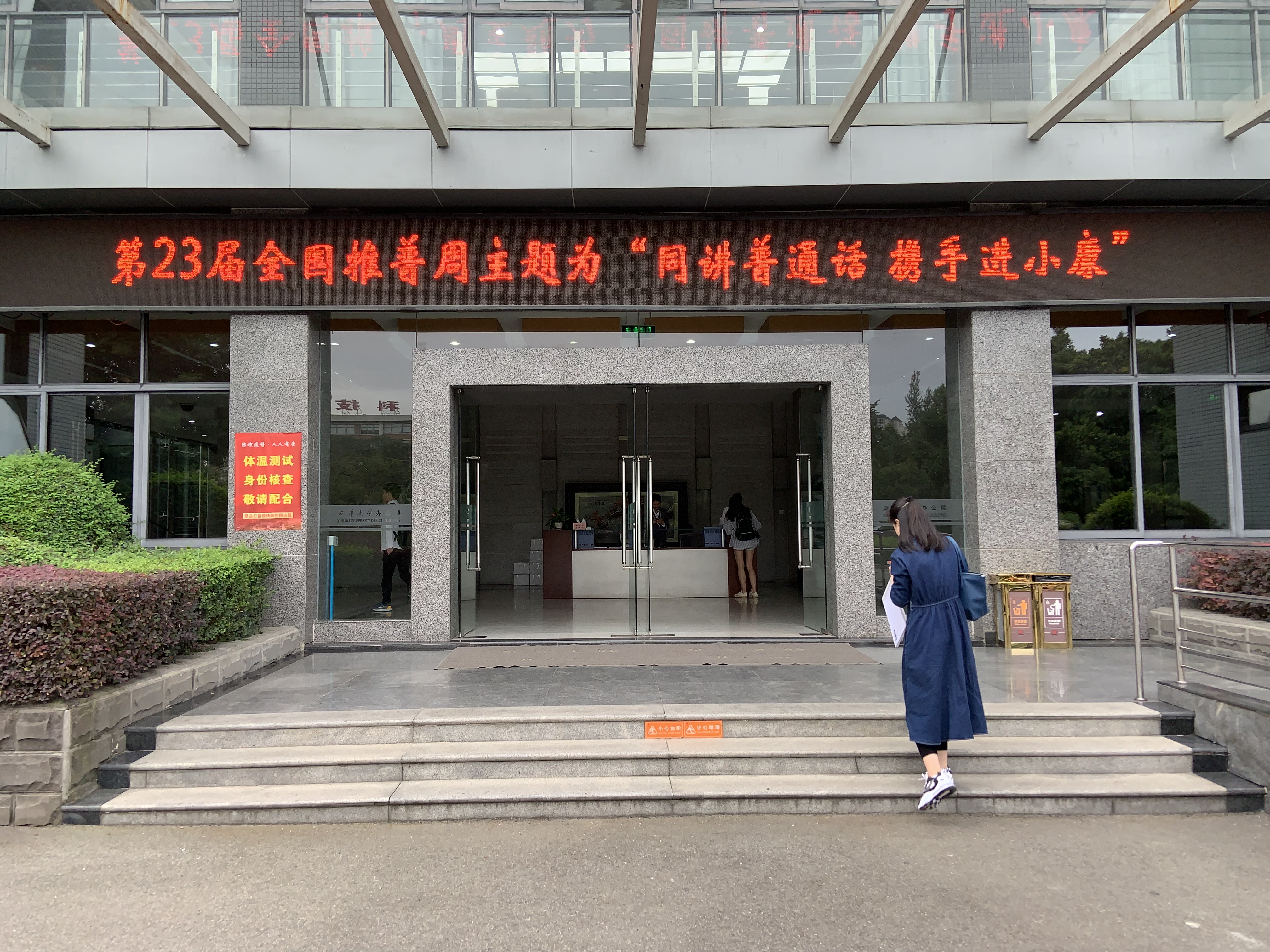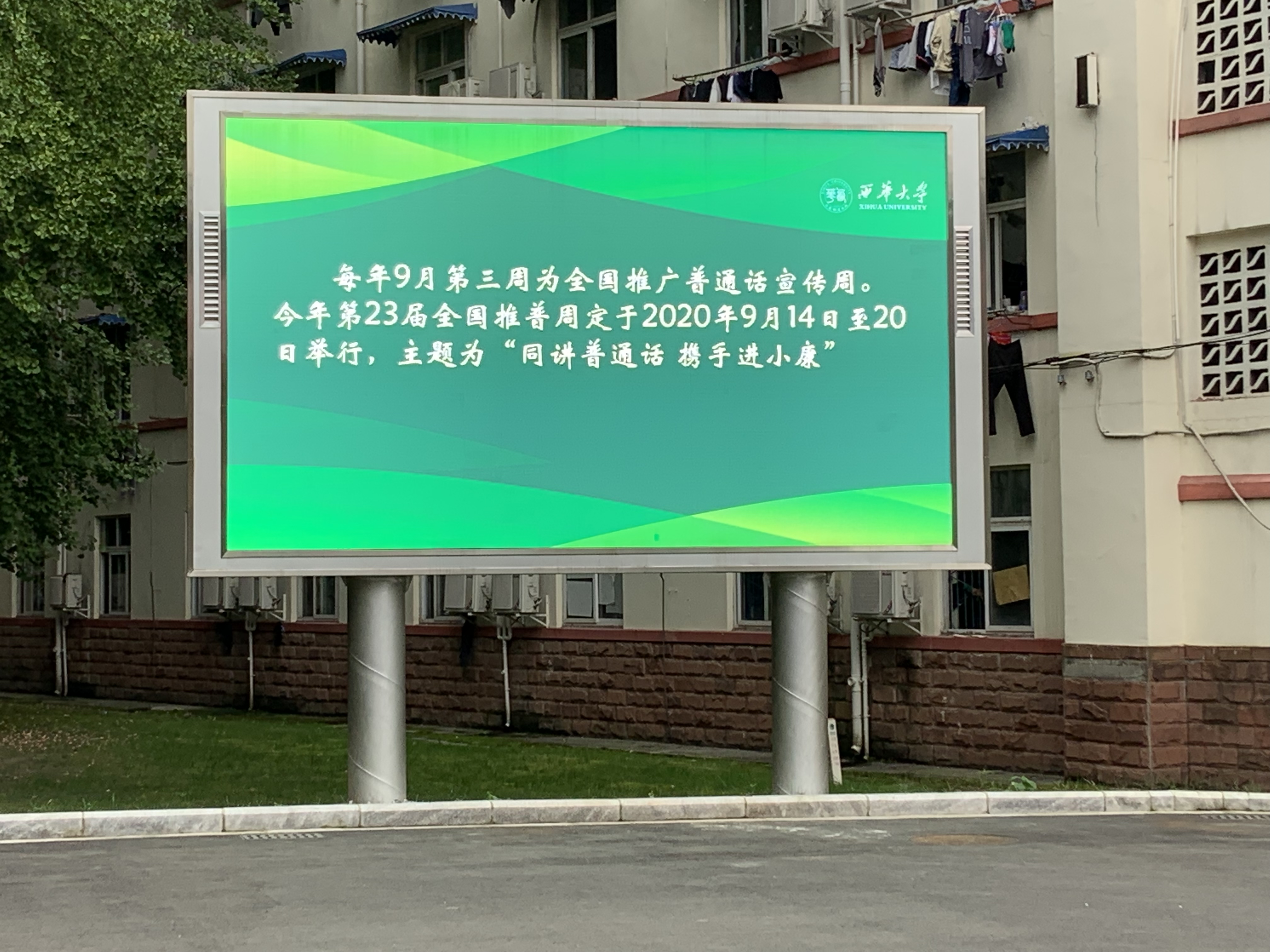 推普周期间,学校充分利用新媒体平台、电子显示屏等多种形式在全校营造推广普通话的浓厚氛围,加大宣传力度。西华大学语言文字工作委员会通过校教师发展中心微信公众号,推送“同讲普通话 携手进小康”第23届全国推广普通话宣传周宣传活动推文,在行政办公区、校园食堂、教学等区域通过电子显示屏滚动播放宣传标语。
