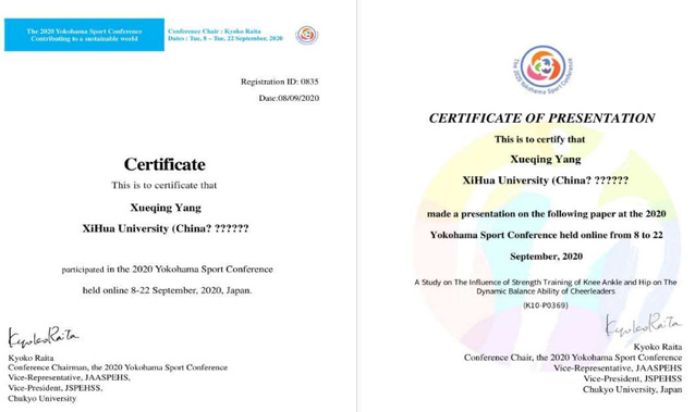 杨雪清老师将西华大学啦啦操代表队32名运动员分为实验组和对照组,探讨连续12周力量训练对啦啦队运动员动态平衡的影响,并对论文的研究目的、研究意义、研究内容及研究结论全程英文PPT演示交流。此项研究为发展高水平啦啦操运动动态平衡专项训练提供参考,获得2020年奥林匹克科学大会荣誉证书,展现了我校体育学院教师较强的科研能力和良好的专业素养。