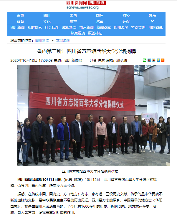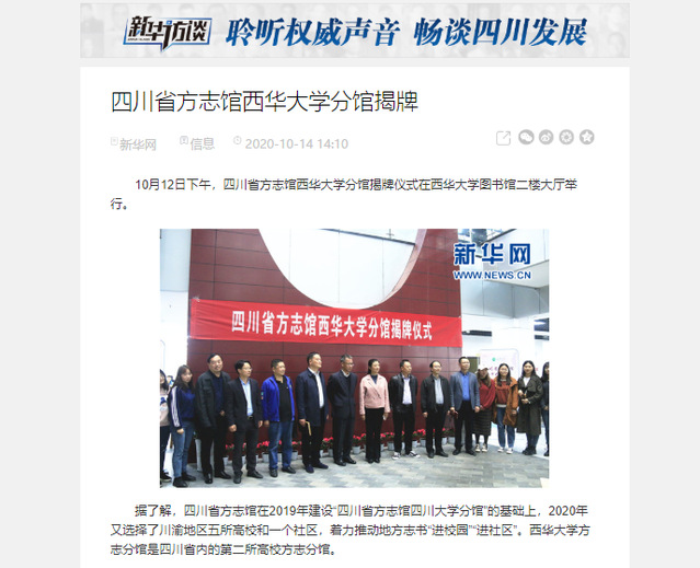 四川省方志馆西华大学分馆揭牌受到了媒体的关注,新华网、中国青年网、四川新闻网、四川发布、四川之声、华西都市报-封面新闻、成都日报-锦观新闻等媒体纷纷对此进行了报道。