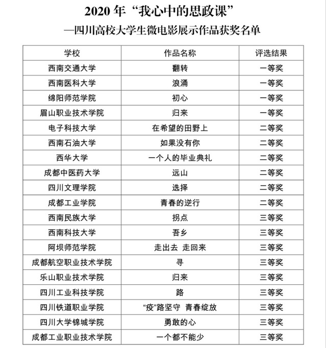 近日,由四川省教育工委主办的“我心中的思政课”—四川高校大学生微电影展示作品征集和评选活动落下帷幕。经过层层评审,由我校马克思主义学院、文学与新闻传播学院共同录制,黄任勇、陈彧、王海容、袁梅、王雨琦、陈炳志、段君奕、王莉、范佳、毛正强等教师指导的作品《一个人的毕业典礼》荣获二等奖。