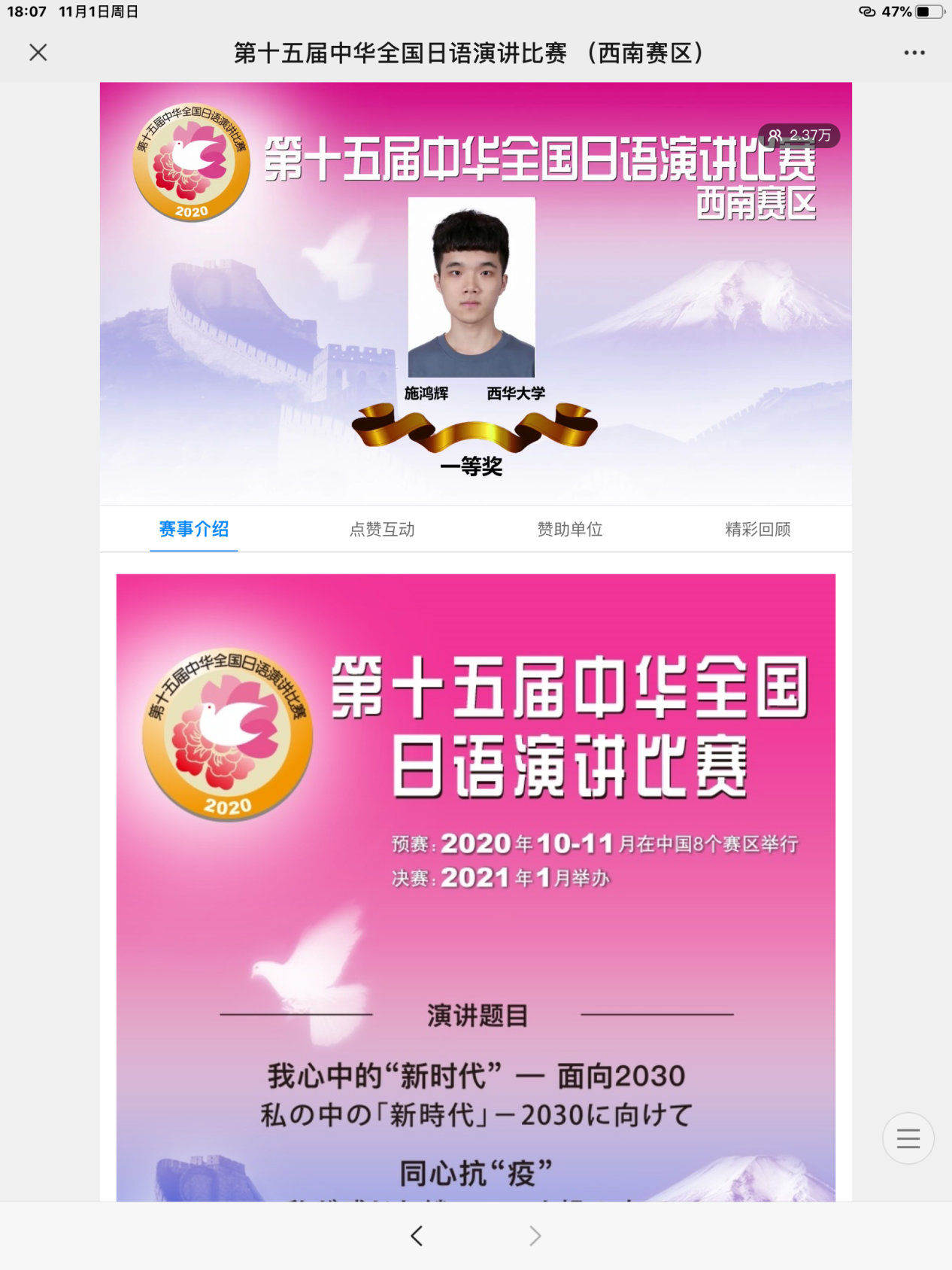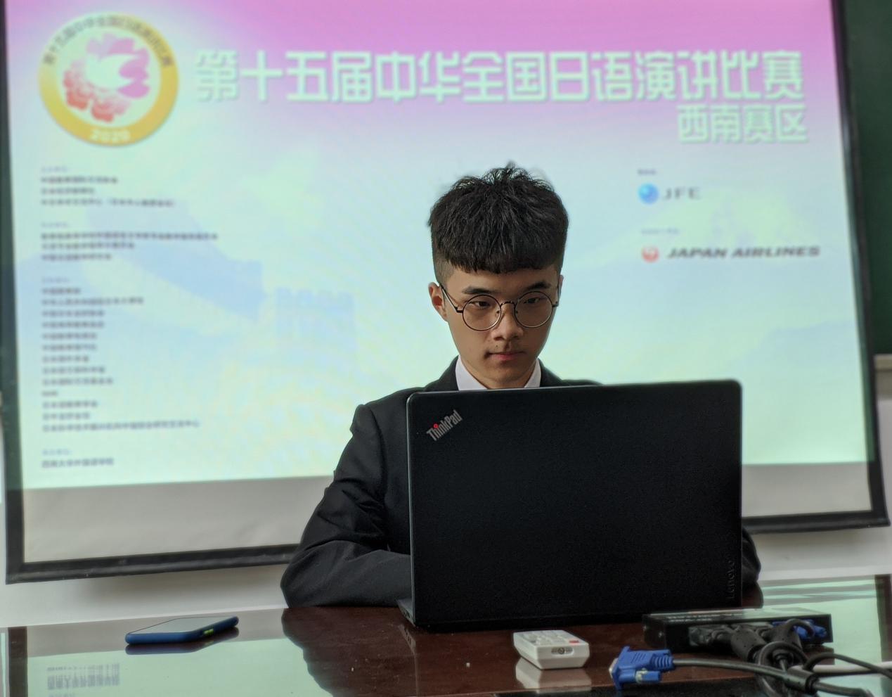 11月1日,2020年第十五届中华全国日语演讲比赛(西南赛区)举行,因疫情防控需要,本次大赛调整为线上进行。来自四川大学、云南大学、西南大学、四川外国语大学等西南地区高校的34名优秀学子参加了本次比赛。我校外国语学院2017级日语专业施鸿辉同学在本次大赛中凭借出色表现获得一等奖,是我校在该赛中取得的最高奖项。