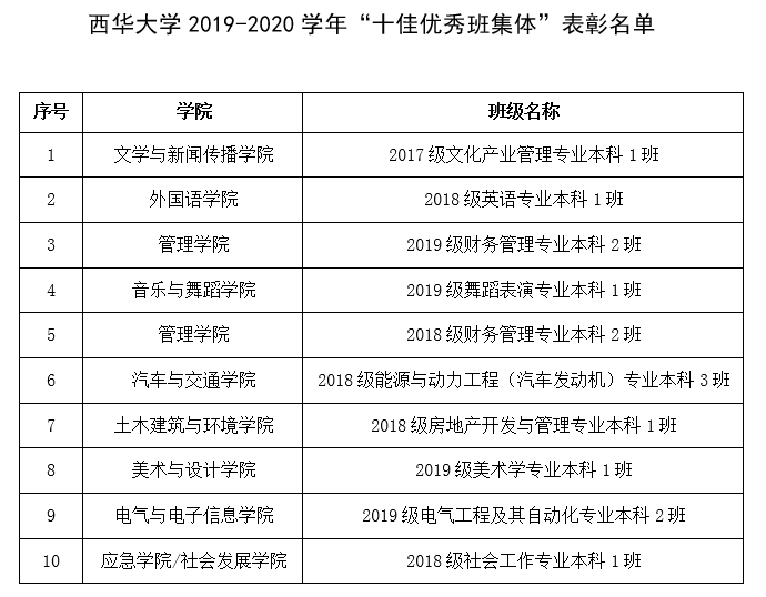 为进一步加强学风班风校风建设,发挥榜样的示范引领作用,根据《西华大学学生奖励办法(修订)》(西华行字〔2019〕129号)文件精神,我校组织开展了2019-2020学年“十佳优秀班集体”评选活动,全校共27个班级参与评选,经过各学院申报、投票、现场陈述,文学与新闻传播学院2017级文化产业管理专业本科1班等10个班级获得西华大学2019-2020学年“十佳优秀班集体”荣誉称号。