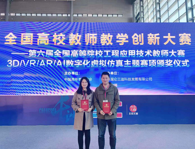 决赛中,三位老师沉着应战,准备充分,在决赛答辩中协同配合,出色完成了面向本科实验教学的虚拟仿真实验的项目介绍与展示。最终以新颖的教学设计、扎实的实践技能和默契的团队配合赢得了评审专家的高度认可,荣获全国高校教师教学创新大赛-3D/VR/AR/AI数字化虚拟仿真主题赛项二等奖。