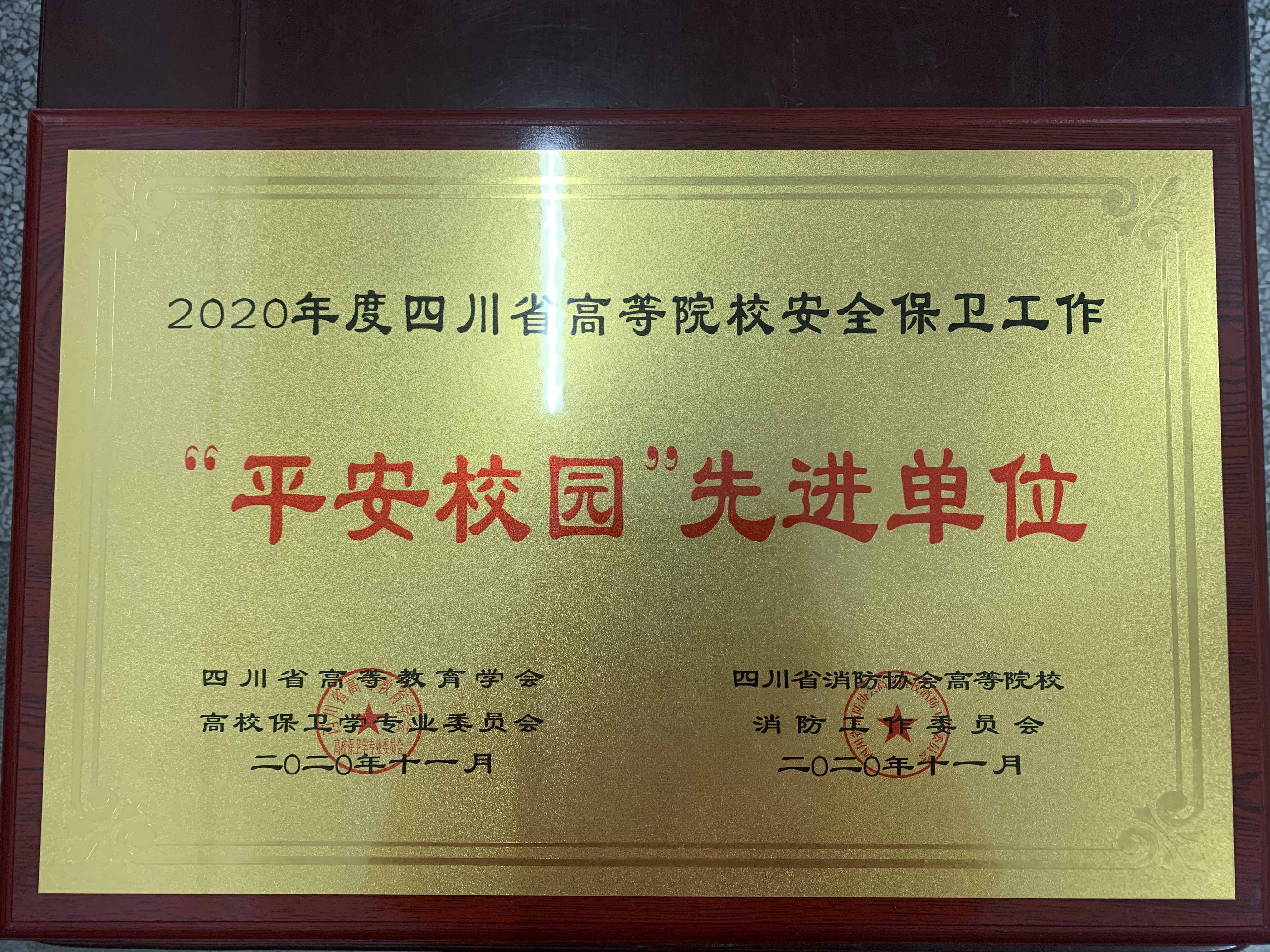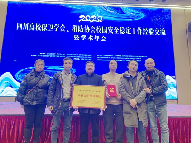 2020年我校再次获得四川省高等院校安全保卫工作“平安校园”建设先进单位,吴丹等6人获得保卫干部先进个人,王德云等8人获得保安先进个人,石浩哲等6人获得学生先进个人。