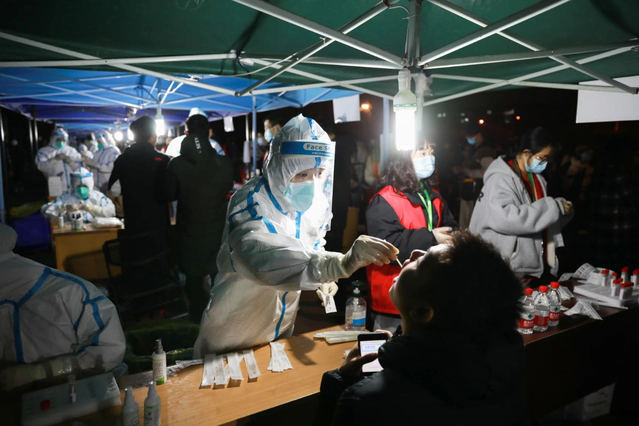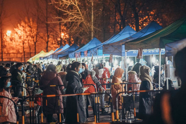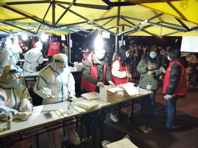 冬季蓉城,寒风凌冽,从日落到深夜,50个检测点位,3.5万在校生,金牛区驰援的100余名医护人员在西华大学上演“中国速度”。在临江和锦地操场上,同学们都有序地排着队,等待核酸检测。志愿者、安保人员们在偌大的操场上来回奔走,维持着现场秩序,即使寒冷和疲惫袭来,他们也耐心地向同学们介绍着检测步骤,辅助医护人员工作。一座座帐篷里,明亮的白炽灯下,医护人员在忙碌着,桌上堆积如小山的医疗品包装袋静静地诉说着他们的辛苦,他们用行动为师生们筑起了一道安全的防线。由于周六是英语四六级考试,学校优先安排参加四六级考试的学生和监考老师测试核酸检测,现场还有学生拿着四六级复习资料,抓住每分每秒复习。