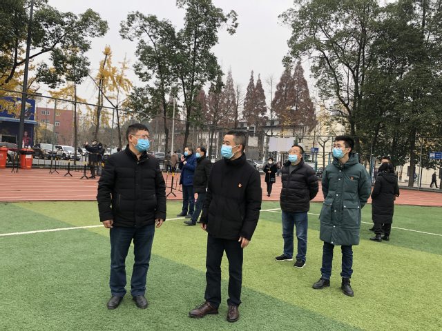 12月12日,学校核酸检测工作继续进行中。凌晨30分,金牛区委常委、常务副区长胡建平,金牛区政府办副主任李勇,金牛区卫健局副局长白中毅一行到学校操场关心指导核酸检测工作。