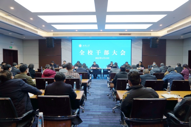 1月13日,学校召开全校干部大会,安排部署期末收尾和假期相关工作,为新学期工作做准备。全体校领导,各职能部门主要负责人,各学院党委书记、院长参会。