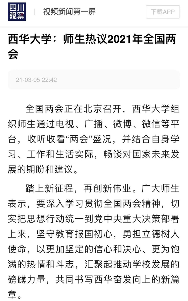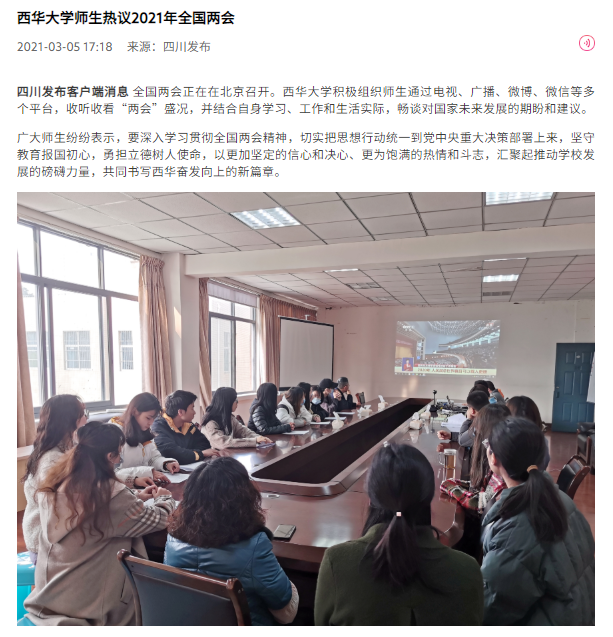 2021年全国两会在北京召开。我校积极组织师生通过电视、广播、微博、微信等多个平台,收听并收看“两会”盛况,结合自身学习、工作和生活实际,畅谈学习体会和对美好未来的期盼。四川发布、四川观察、四川新闻网、教育导报网、四川经济在线等媒体对此进行了报道。