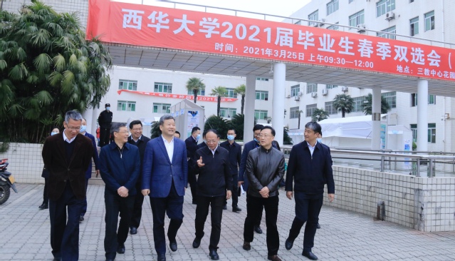 曹立军一行来到招生与就业处,查看了学校将举行的春季第3场双向招聘会现场筹备情况,听取了学校关于应届高校毕业生就业工作情况的汇报,详细询问了学校最受用人单位欢迎的专业、毕业生去向等情况。曹立军一行还来到招聘现场,观摩校园招聘会,与招聘单位交流。