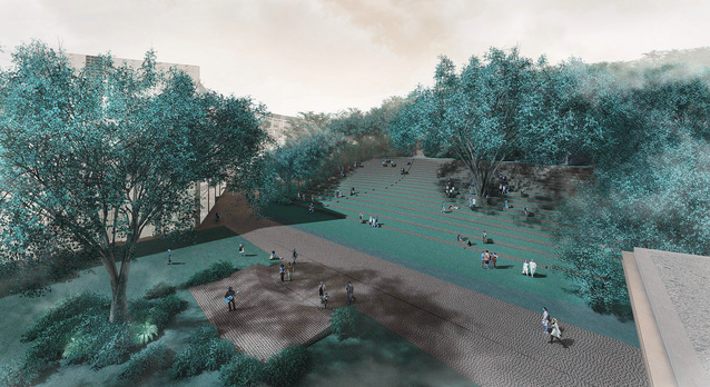 校区所有的景观围绕校园中心保留的小山丘展开,小山丘作为校园的“绿心”,向围绕四周的庭院发散,形成“处处有景、开门见绿、步移景异”的山水画卷。院落也吸取了川南传统建筑特色和优点,不仅有小气候调节功能,还营造了一个无顶的公共活动空间。视线穿过校门前广场和图书馆巨型门洞,跨过大台阶,近观小山丘(绿心),远观观斗山,形成一条“通天达地”的景观中轴线。
