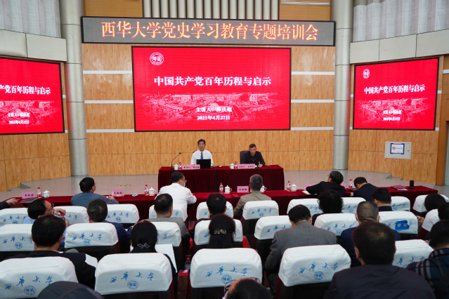 4月27日上午,为深入贯彻落实中央、省委的决策部署,推进全校党史学习教育工作走向深入,学校在四教报告厅举行了党史学习教育专题培训会暨党委理论学习中心组(扩大)学习会,邀请原中共中央党史研究室宣传教育局副局长薛庆超教授作题为《中国共产党百年历程与启示》的辅导报告。全体校领导、副处级及以上领导干部、学校党史学习教育宣讲团成员及师生代表参加会议。会议由校党委书记余孝其主持。