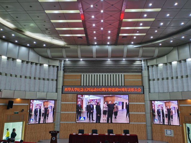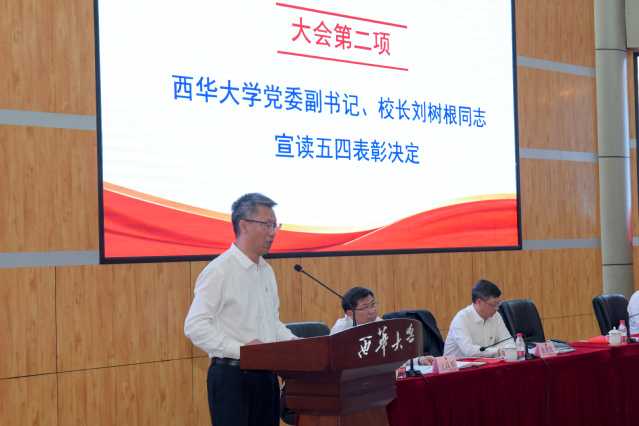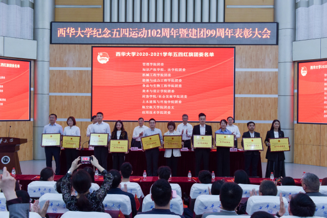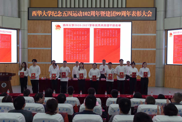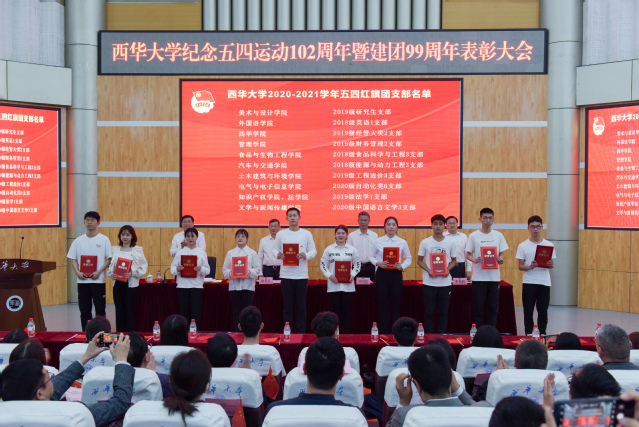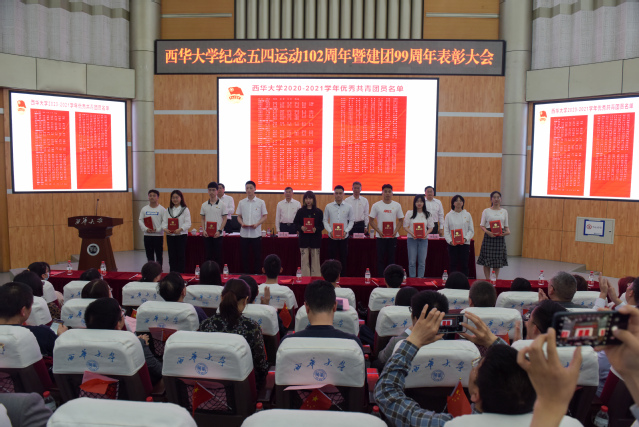 大会在激情高昂的《没有共产党就没有新中国》合唱中拉开了帷幕,大会对过去一年在共青团工作中涌现出的一批先进集体和优秀个人进行了表彰。校长刘树根宣读了《西华大学关于表彰2020-2021学年五四青年节先进集体和优秀个人的决定》。郭倩等1727名“优秀共青团员”,张博斌等921名“优秀共青团干部”,马克思主义学院2018级思想政治教育专业团支部等142个“五四先进团支部”,美术与设计学院2019级研究生团支部等10个“五四红旗团支部”,管理学院团委等10个“五四红旗团委”受到学校表彰。出席大会的校领导为受到表彰的集体和个人颁奖。会上,受到表彰的“五四红旗团委”单位代表,知识产权学院、法学院团委书记刘颖和“优秀共青团干部”代表、食品与生物工程学院杨家城同学分别作了交流发言。