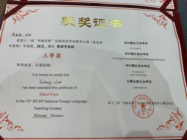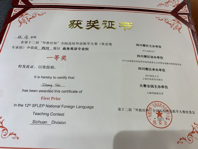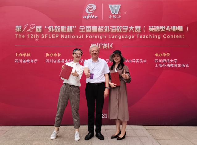 6月11日-13日,第十二届“外教社杯”全国高校外语教学大赛(英语类专业组)四川赛区比赛在四川师范大学圆满落幕。我校外国语学院青年教师张诗、罗雨虹分别斩获本次大赛商务英语专业组一等奖、英语专业组三等奖。外国语学院院长陈达教授受邀担任本次大赛复赛和决赛评委。