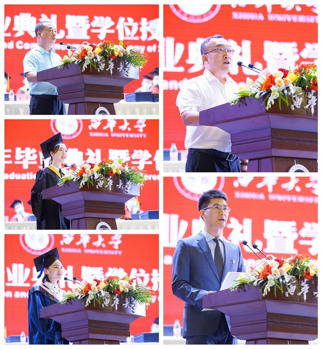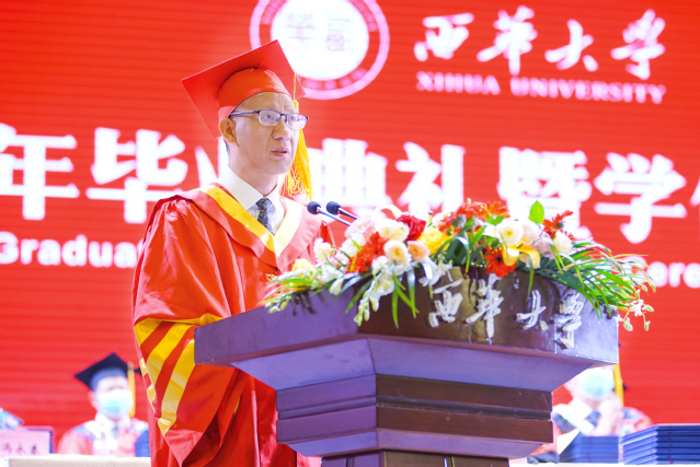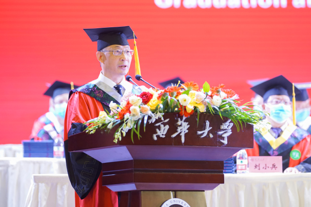 校学位评定委员会主席、校长刘树根以《在百年党史中感悟初心与使命 在奋斗征程中肩负责任与担当》为题,向全体毕业生送上临别寄语和真挚祝福。他回顾了2021届毕业生一起经历和见证的重要时刻和事件,细数毕业生在西华求学生涯中取得的骄人成绩,赞扬了毕业生用奋斗诠释了青春风采和强烈的责任感,证明新时代青年的可堪大任。
