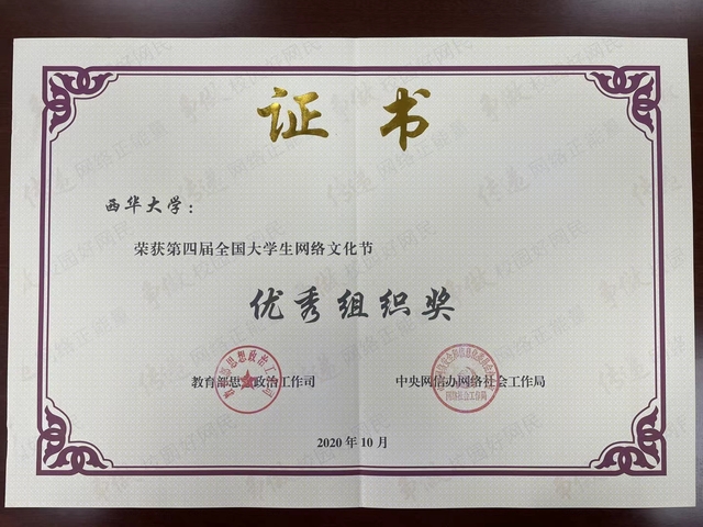 会议举行了“共抗疫情、爱国力行”主题宣传教育和网络文化成果征集展示活动优秀成果集中颁奖。据悉,此次活动共收到全国千余所高校10万余件作品,从中评选出视频类一等奖8 项、二等奖15项、三等奖18项、优秀奖24项。西华大学共有8项作品获奖,报送的作品《责任》荣获一等奖,学校获优秀组织奖。