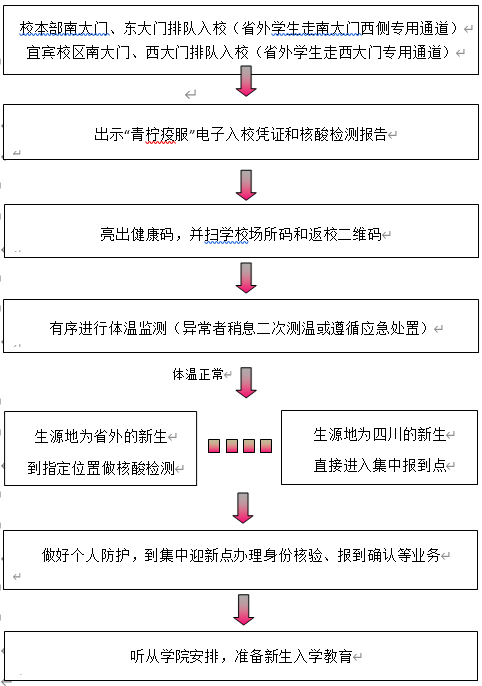 4、四川省外生源的学生到校报到时,校本部从南大门(老成灌路)、宜宾校区从西大门走专用通道入校报到。四川省内生源的学生到校报到时,校本部从学校南大门或东大门入校,宜宾校区从南大门或西大门入校。新生进入校门时,须服从校门工作人员安排,经亮码(“四川天府健康通”绿码)、扫码(扫学校场所码和到校二维码)、测温、验证(登机登车前48小时内核酸检测阴性证明及入校报到凭证)等环节后进入校园。