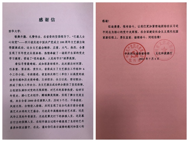 近日,我校收到中共四川省委宣传部、文化和旅游厅发来的感谢信,信中写到:“在省委的坚强领导下,‘巴蜀儿女心向党’——四川省庆祝中国共产党成立100周年文艺演出取得圆满成功。看似寻常最崎岖,成如容易却艰辛。此次演出时间紧、任务重、要求高、责任大,演职人员历时3个月,不舍昼夜、风雨无阻,全情投入排练,共同呈现了这台代表目前全省最高艺术水准的文艺盛会。在此,谨向西华大学表示诚挚的慰问和衷心的感谢!”