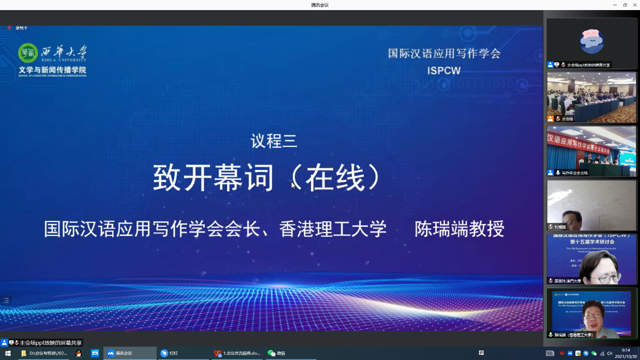 10月29日至10月31日,由国际汉语应用写作学会主办,西华大学文学与新闻传播学院承办的“国际汉语应用写作第十五届学术研讨会”在成都召开。国际汉语应用写作学会会长、香港理工大学陈瑞端教授,国际汉语应用写作学会常务副会长、湖北大学公共管理学院洪威雷教授,澳门大学中国语言文学系谭美玲副教授及北京师范大学等68家单位的专家学者以线上和线下的方式参加本次大会。