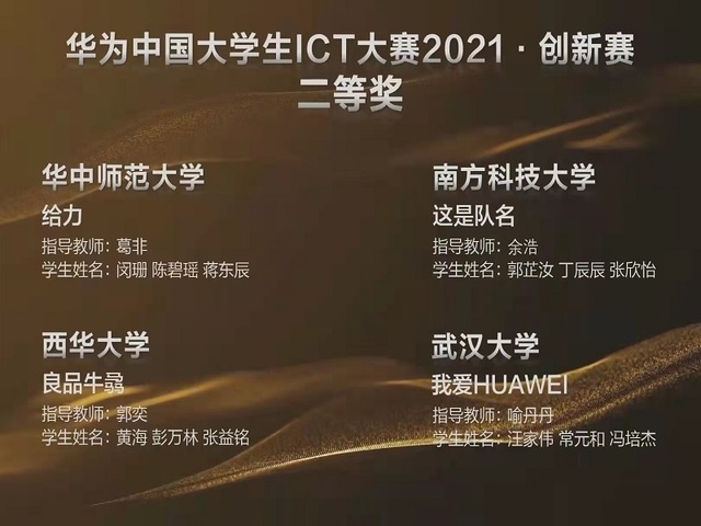 12月25日晚,华为中国大学生ICT大赛2021年总决赛举行线上直播颁奖典礼,我校电气与电子信息学院WNCG实验室成员黄海、彭万林和张益铭组建的良品牛骉团队,在指导教师郭奕的带领下斩获大赛二等奖,赵梓同、戈棋和段媛组建的明悟123团队,在指导教师吕承的带领下荣获三等奖。